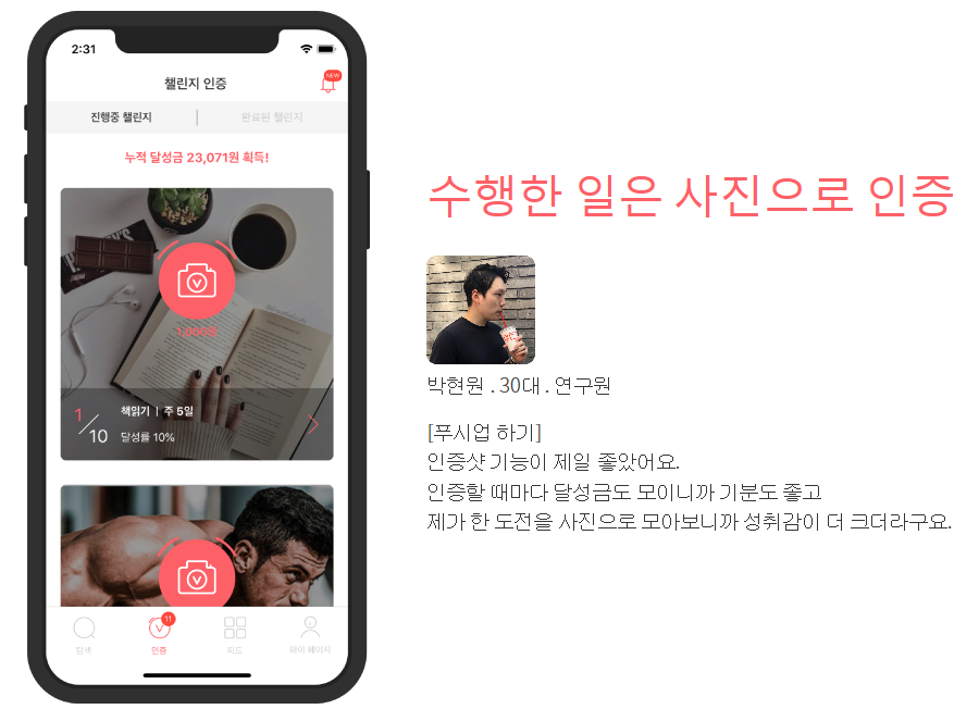 전 국민 목표달성 프로젝트! '챌린저스'는 확실한 목표달성과 꾸준한 습관형성을 책임지는 어플이래요. 다이어트나 영어공부, 운동, 책 읽기 등 시작은 원대하고 끝은 기억도 안 나는 도전들. 참 많지요? 이번엔 꼭! 달성할 수 있을 거예요. 그 비결은 바로 '돈'과 '경쟁자'입니다. 방법은 아주 간단합니다. 내게 필요한 도전과제를 골라 원하는 만큼의 참가비를 걸어요. 그리고 기간을 정합니다. 오늘의 도전은 간편하게 사진으로 인증해서 올리면 되는데요, 1회 인증할 때마다 환급금이 쌓이지요. 85% 이상 달성하면 걸었던 참가비 전액을 환급받을 수 있으며, 100%를 달성하면 추가로 상금까지 받을 수 있어요. 나와 같은 목표를 가진 사람과 함께하기 때문에 서로 자극도 되고 격려도 해줄 수 있어 더욱 효과가 좋다고 합니다. 나날이 쌓여가는 인증샷을 보면 말도 못 하게 뿌듯하다고 하네요!