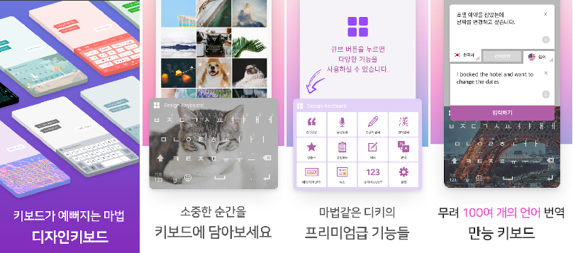 무려 100만 다운로드를 돌파한 '디자인 키보드'. 디자인 키보드는 10만 종의 무료 배경 사진을 제공하며, 각 배경 사진의 투명도 및 키보드 버튼의 투명도, 밝기 등을 내 취향에 맞게 조절할 수 있어요. 그뿐만 아니라, 다양한 종류의 이모티콘과 움짤을 보유하고 있어요. 이모티콘을 내 마음대로 편집하고 문장도 넣어 공유할 수 있기 때문에 재미 요소가 풍부합니다. 이렇게 감성을 터치해주는 것은 기본! 더 놀라운 점은 메모장, 영어사전, 실시간 뉴스 검색, 음성인식, 186개의 언어번역 등 똑똑한 기능까지 갖췄다는 것이에요. 엄청나지요? 다만 아쉬운 점은 안드로이드에서만 사용이 가능하다고 합니다. 어서 iOS에도 진출해주세요!
