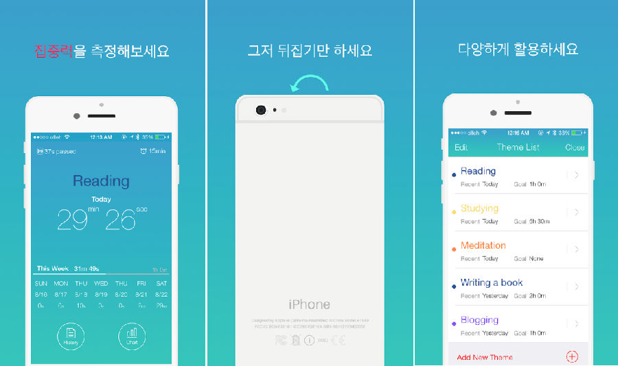 공부할 때 가장 중요한 것은 '집중력' 아니겠어요? 집중력을 흐리는 주범, 스마트폰! 고시생이 되면 가장 먼저 핸드폰을 처분하게 되는데요, 우린 그렇게까지 하려는 건 아니니까 '포커스타이머'의 도움을 받아봅시다. 집중해야 하는 목표 시간을 스스로 설정한 후, 그 시간만큼 휴대폰을 뒤집어 두면 그 시간이 자동으로 기록에 남습니다. 뒤집어 놓는 동안에는 문자나 전화, 푸쉬 알림이 오지 않도록 설정할 수도 있어요. 핸드폰을 다시 원래대로 뒤집으면 얼마 동안 핸드폰을 안 봤는지 시간이 나타나요. 공무원 시험을 준비하는 분이나 수험생은 집중해 공부한 시간을 '순공 시간'이라고 부른답니다. 순수하게 공부한 시간이라는 뜻이겠지요? 공부한다고 10시간 앉아있었는데 실제 공부한 시간은 2~3시간 정도밖에 안 된 것 같은 느낌적인 느낌. 다들 아시잖아요? 하루, 일주일, 한 달간의 기록을 통계로 상세하게 분석해주기 때문에 내가 얼마나 집중했는지, 언제가 고비였는지 등을 확인하며 합리적으로 반성할 수 있답니다.