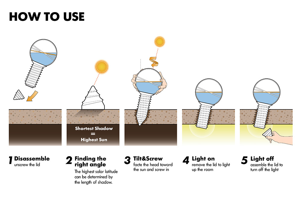 요 기특한 '빛깔대기'의 장점을 꼽아보자면, 첫째, 나사 모양으로 생겨 특별한 도구 없이도 흙집에 간편 설치가 가능해요. 둘째, 약 1.99달러(한화로 2,560원)의 저렴한 설치 비용이 들어요. 셋째, 낮의 태양을 이용한 자연조명 효과를 극대화할 수 있는 장치예요. 어느 정도냐 하면, 흙집에 이 '빛깔대기'를 꽂았을 때 90lx(럭스(lux) 조명 단위)의 밝기가 되는데요, 우리가 보통 실내에서 사용하는 밝기가 50~100lx 정도이니 꽤 밝은 편입니다. 낮에도 어두컴컴한 흙집에 그야말로 한 줄기 빛이 되겠네요.