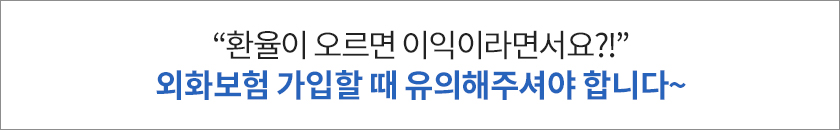 최근 인터넷 블로그 등에서 외화보험이 환차익을 얻을 수 있는 금융상품으로 소개되는 경우가 있습니다. 달러가 강세일 때, 단기적인 환테크의 수단으로 외화보험에 가입하는 것이 유리하다고 생각할 수 있지요. 하지만 외화보험에 가입한 이후에 환율이 하락하면 계약해지 외에는 환율변화에 능동적으로 대처할 만한 방안이 마땅치 않다는 것을 유의하셔야 해요! 게다가 계약을 해지할 경우 해약환급금이 원금보다 적을 우려가 있습니다. 따라서, 외화보험이 단기적인 환테크를 위한 수단이 아니라는 것을 기억해주세요.