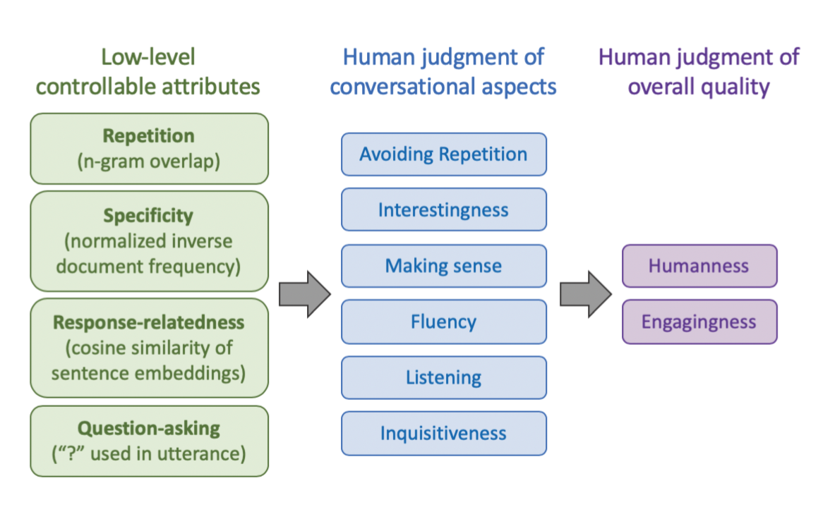 말씀드린 것처럼 인간의 입장에서 결론은 그저 그렇습니다. 당연한 걸 연구했다는 생각이 들 정도이죠. 그럼 챗봇의 관점에서 다시 생각해볼까요? 챗봇에게는 큰 성과입니다. 반복, 구체성, 응답 관련성, 질문 등 몇 가지 속성을 조절해 인간의 대화를 구현할 수 있게 되었어요. '어떤 기준을 적용해 인간다운 대화에 가까워질 것인가'에 대한 답을 찾아가고 있는 것이죠.