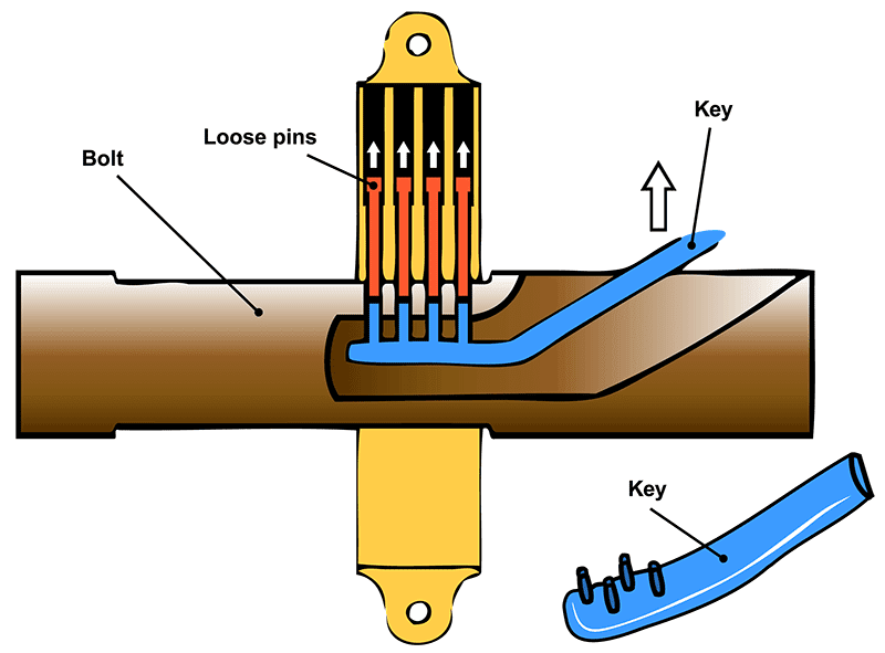 앞서 살펴본 아시리아와 이집트의 핀 자물쇠는 그 구조가 다소 단순한 편이었습니다. 자물통에 핀을 꽂아 잠그고 열쇠의 돌기로 핀들을 들어올려 여는 식이죠. 이 글에 첨부된 사진 자료만으로도 작동 방식이 대강은 이해되는 정도랄까요?