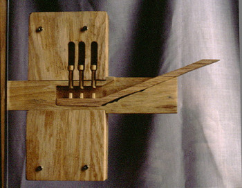 외관을 한 번 볼까요? 자물통에 해당하는 부분에는 핀 세 개가 수직으로 꽂혀 있습니다. 열쇠에 붙은 세 돌기를 세 핀들의 하단부와 접촉시켜 들어올리면 잠금 해제되는 방식입니다. '아시리안 핀 락(Assyrian pin lock)'이라 불리는 이 자물쇠는 고대 이집트의 목재 자물쇠와 매우 흡사해요. 그래서 혹자는 아시리아 자물쇠의 발전형 모델이 이집트 자물쇠라 보기도 합니다.