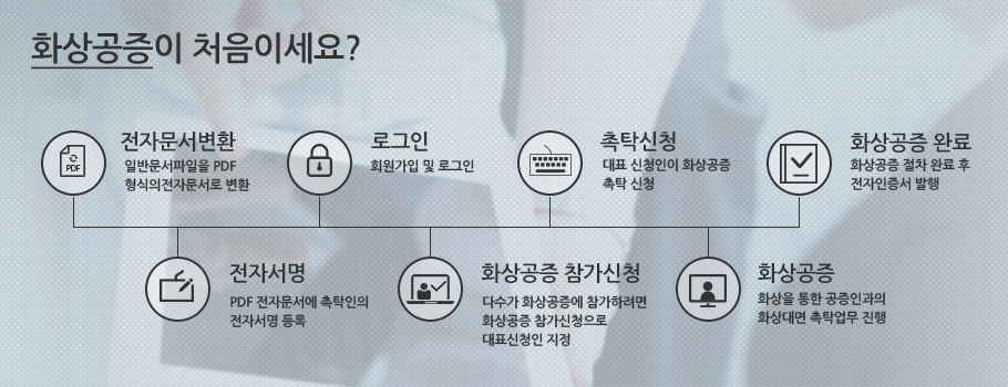 화상공증시스템을 이용하는 방법은 아주 간단합니다. 전자문서 변환-전자서명-회원가입 및 로그인-화상공증 참가 신청 또는 촉탁 신청-화상공증(화상통화)-완료의 단계를 인터넷으로 수행하면 되거든요.