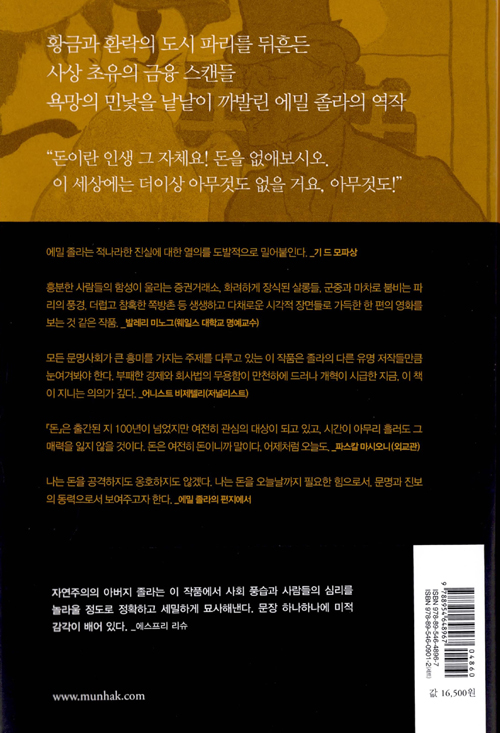 이렇듯 돈의 흐름새가 점차 조직화되고 거대해지면 투기가 늘기 마련이죠. 에밀 졸라의 <돈>은 바로 이런 시대상을 배경으로 한 작품입니다. 100년도 훨씬 넘은 시절의 '본격 금융 소설'이지만 오늘날 읽어도 여전히 흥미진진합니다. 금융시장의 생리를 알고 읽으면 더 큰 감흥을 얻게 되실 거예요.