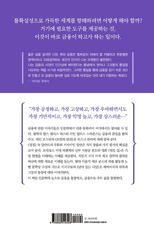 독특한 점은 저자가 제인 오스틴, 존 밀턴, 조지 오웰 같은 문학가들의 작품을 자주 인용한다는 것입니다. 인문(人文)이라는 단어는 '인간에게 새겨지는 무늬'를 의미하죠. 금융이 현대인들의 일상과 사회에 영향을 미칠수록 '인문'도 늘어나는 셈입니다. 저자는 이 같은 인문학적 태도로 금융과 인간의 관계 맺기를 차근차근 설명해 나갑니다.