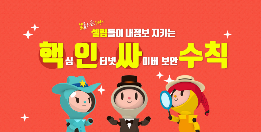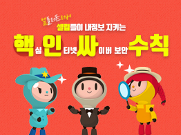 올해 캠페인에서는 우리 삶의 필수템인 '스마트폰'을 주제로 다양하고 유익한 정보를 준비했어요. 일명 '셀럽(셀룰러폰 러버)들이 내정보 지키는 핵.인.싸.(핵심 인터넷 싸이버) 보안 수칙!'