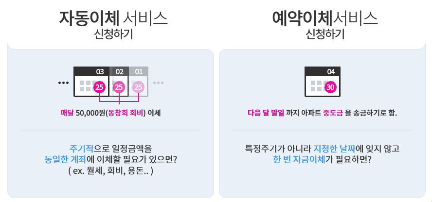 2. 자동이체 및 예약이체 서비스: 월세·용돈·회비 송금과 같이 주기적으로 일정금액을 이체해야 한다면, 매번 일일이 이체 신청을 하지 않아도 내 계좌에서 일정금액을 특정 동일한 계좌로 자동이체 해주는 ‘자동이체 서비스’를 이용해보세요. 한편, '특별한 날' 특정일에 잊지 않고 한번 자금을 이체하고 싶을 때는 예약된 날짜에 자금을 이체해주는 ‘예약이체 서비스’도 이용할 수 있습니다. (타행으로 이체할 경우 수수료가 부과될 수 있습니다.)