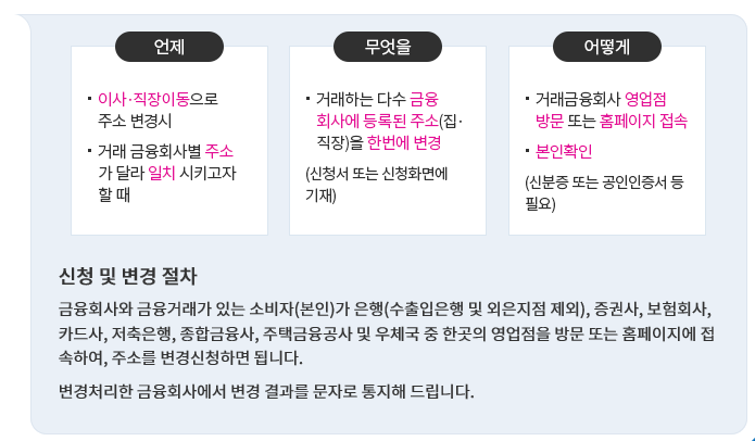 3. '금융주소 한번에' 서비스: 금융소비자가 주소를 변경하기 위해 금융회사를 일일이 방문하거나 연락해야 하는 번거로움을 줄이고자 금융회사들이 협조하여 한 금융회사에 신청하면 다른 금융회사로 소비자의 주소를 일괄적으로 변경 신청해주는 서비스입니다.