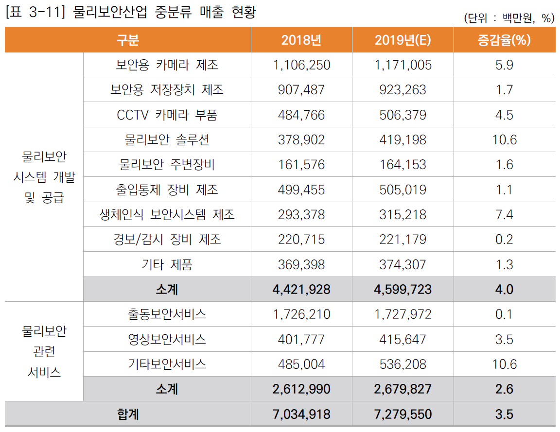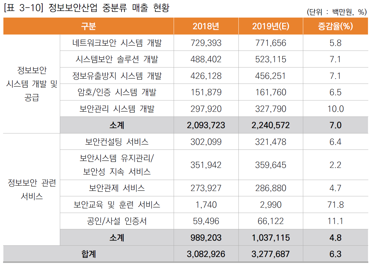 「2019 국내 정보보호산업 실태조사」 결과를 한 줄로 요약하면 '지난해 매출보다 4.3퍼센트 오른 10조 5,000억 원 기록'이라 할 수 있는데요. 정보보안 산업과 물리보안 산업의 매출 규모가 각각 3조 2,700억 원(전년 대비 6.3% 증가), 7조 2,800억 원(전년 대비 3.5% 증가)으로 나타났죠.