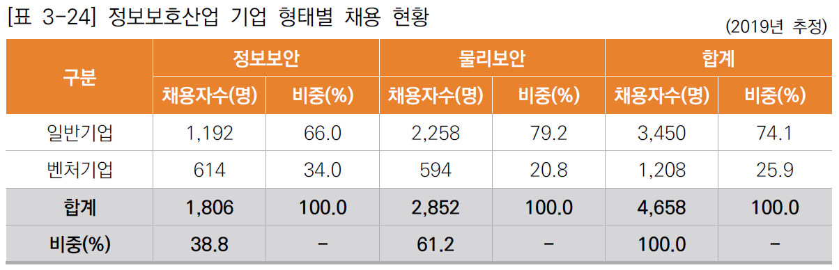「2019 국내 정보보호산업 실태조사」에 따르면, 지난해 기준으로 우리나라 보안산업 관련 기업들은 정보보안 산업 473곳(일반기업 309곳 + 벤처기업 164 곳), 물리보안 산업 621곳(일반기업 344곳 + 벤처기업 277곳) 등 총 1,094곳이었습니다. 이 기업들이 지난해 4,658명을 채용한 데 이어, 올해엔 4,121명을 채용할 계획이라고 합니다. 신입에 비해 경력직 채용 규모가 좀 더 많고요.(표 3-25 참조)