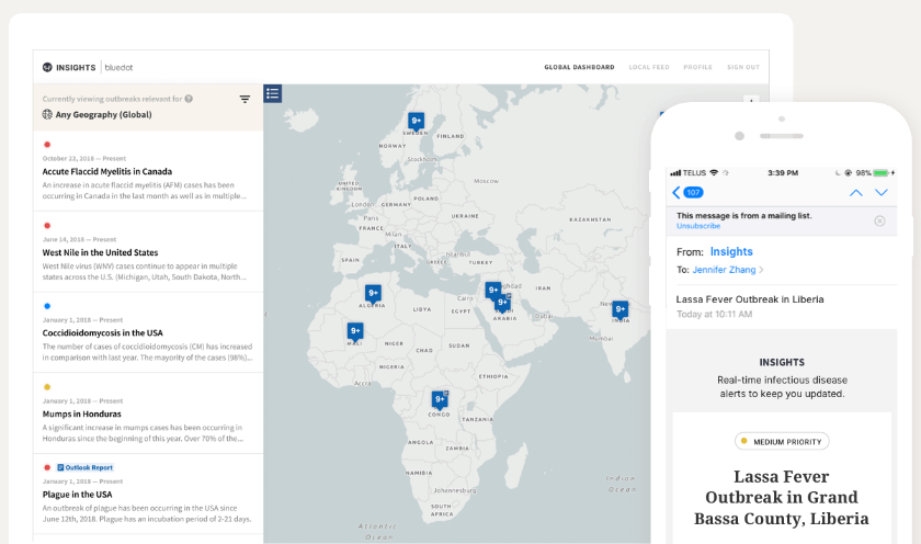 블루닷은 2003년, 사스(SARS)의 확산을 경험한 감염 내과 전문의인 '캄란 칸'이 전염병 확산 경로를 연구하면서 시작됐습니다. 2009년에는 우리나라를 비롯해 전 세계를 들썩이게 했던 신종 인플루엔자의 확산을 분석, 예측하면서 서서히 자리를 잡았지요. 캄란 칸은 2013년, 이 프로젝트를 비즈니스로 만들고 본격적으로 감염병 예측 솔루션을 개발했습니다. 이후에도 지카 바이러스 등 몇 년을 주기로 세계를 공포에 몰아넣는 전염병을 토대로 실험을 지속했고, 2019년 12월 자체 리포트를 통해 중국 우한 지역의 코로나 바이러스가 인접 도시 및 국가로 번져 나갈 수 있다고 경고했어요.
