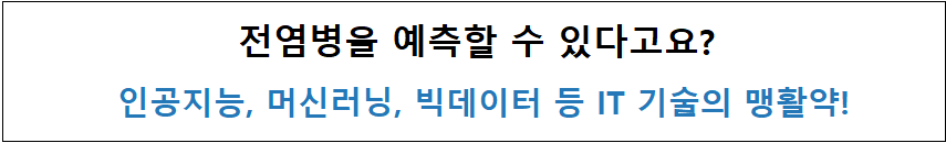 생각지도 못했던 '코로나19' 바이러스로 몸도 마음도 지치는 요즘입니다. 별일 없이 흘러갔던 평범한 일상이 아득하게 느껴져요. 하루빨리 그때로 돌아갈 수 있기를 바라며, 조금만 더 인내심을 가지고 슬기롭게 이겨내도록 해요! 주변을 둘러보면 추가적인 확산을 막기 위해 곳곳에서 애써주시는 분들이 참 많더라고요. (다시 한번 감사의 마음을 전합니다) 여기에 IT 기술까지 힘을 얹고 있다는 소식을 접수했습니다. 과연 빅데이터나 인공지능, 머신러닝 기술 등은 이러한 상황에서 어떻게 활용될 수 있는지 같이 살펴볼까요?
