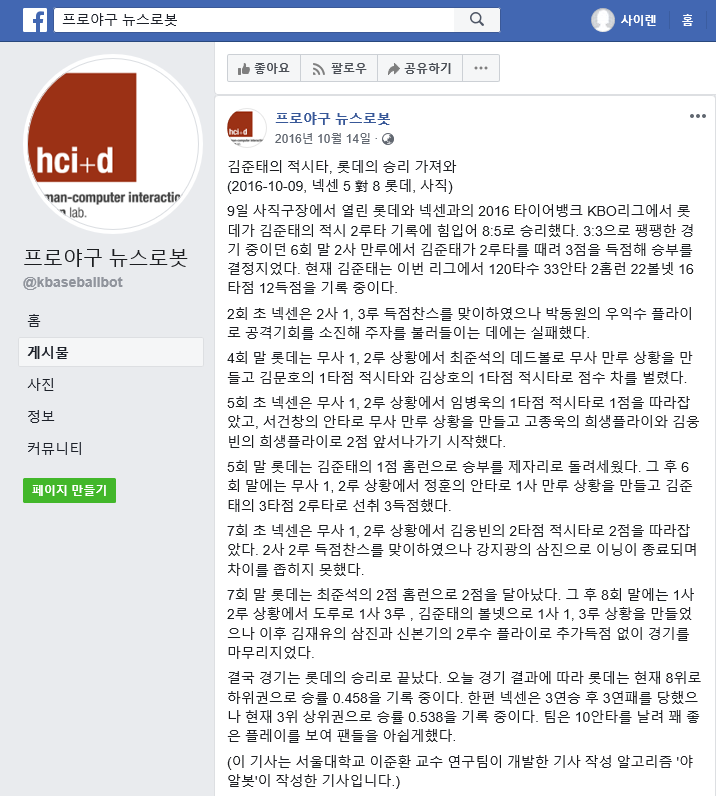 글 쓰는 AI들은 이미 여러 언론 매체를 통해 소개된 바 있습니다. 우리나라의 경우, 서울대학교 hci+d 랩(human-computer interaction & design lab. http://hcid.snu.ac.kr)에서 개발한 '야알봇'을 빼놓을 수 없습니다. 프로야구 뉴스 기사 작성 로봇이에요. 인간 기자가 쓰는 스트레이트 기사와 견주어도 크게 어색하지 않은 문장력을 보여줍니다. 거두절미하고, 야알봇이 쓴 기사를 직접 읽어보시지요!