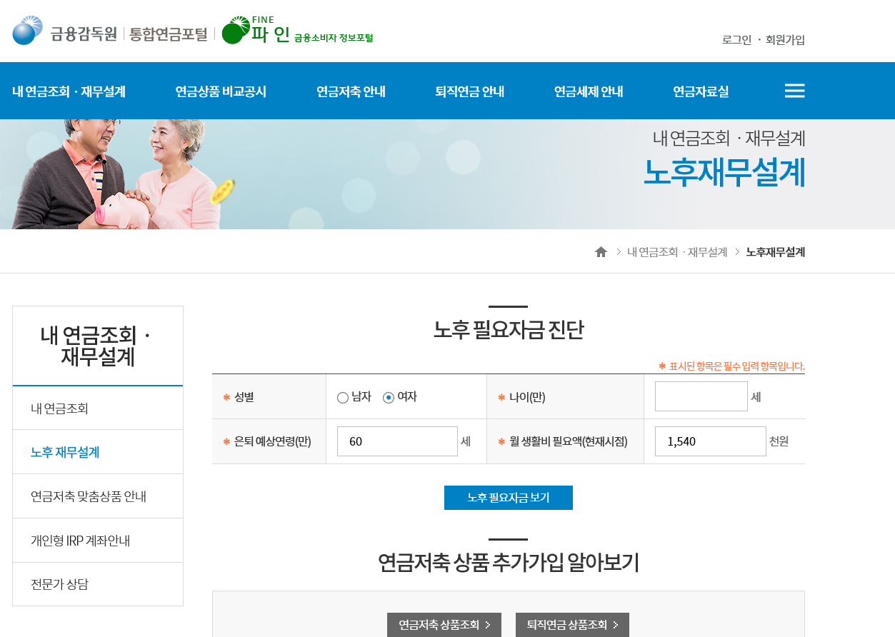 '노후 재무설계'로 똑똑한 노후준비를 시작하세요. 포털 내 '노후 재무설계' 페이지로 들어가면 회원가입 없이 나이와 은퇴시기만으로도 노후필요자금 및 월 생활비 필요액을 미리 알아볼 수 있어요. 진단 후에는 바로 연금 상품 조회가 가능하도록 연결되어 있으며, 자세한 재무 상담이 필요할 경우 금융감독원 콜센터(국번없이 1332, 7번 금융자문서비스)로 전화 상담을 요청하면 됩니다. 올해는 '간편 세금 계산' 시스템이 도입돼 연금 중도해지 및 중도 수령 시, 세 부담액까지 계산해볼 수 있어요.