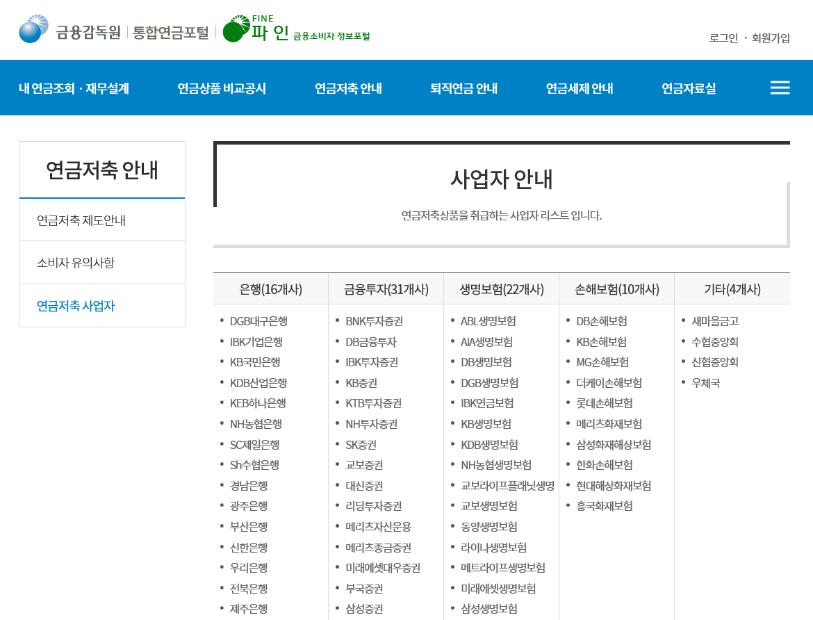 더 이상 연금저축상품을 알아보기 위해 발품을 팔지 않아도 됩니다. 통합연금포털에선 현재 판매 중인 모든 판매사의 연금저축 수익률 및 수수료율을 비교해줘요. 또한, 소비자 선호도 및 자금운용계획에 따른 맞춤형 상품을 소개해 효과적으로 연금을 관리할 수 있답니다. 한눈에 비교할 수 있게 가입채널별, 공시이율별 정렬을 소비자가 직접 선택할 수 있도록 했어요. 가입을 원하는 연금저축보험상품을 선택하면 해당 회사의 가입메뉴로 이동됩니다.