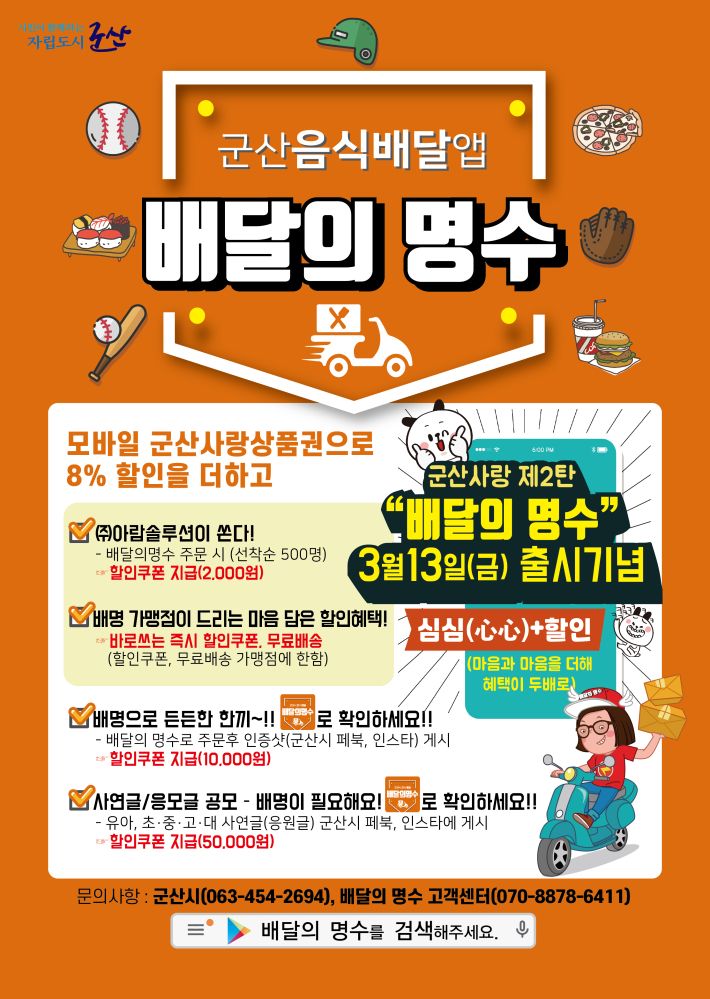 '배달의 명수'는 전북 군산시가 소상공인과 시민들을 위해 개발한 공공 배달앱이에요. 가맹점에는 가입비와 수수료, 광고료를 받지 않고, 소비자에게는 포인트 지급 등의 할인 혜택을 더했다고 합니다. 앱 개발비는 물론이고 운영비도 모두 군산시에서 부담하고 있어요.
