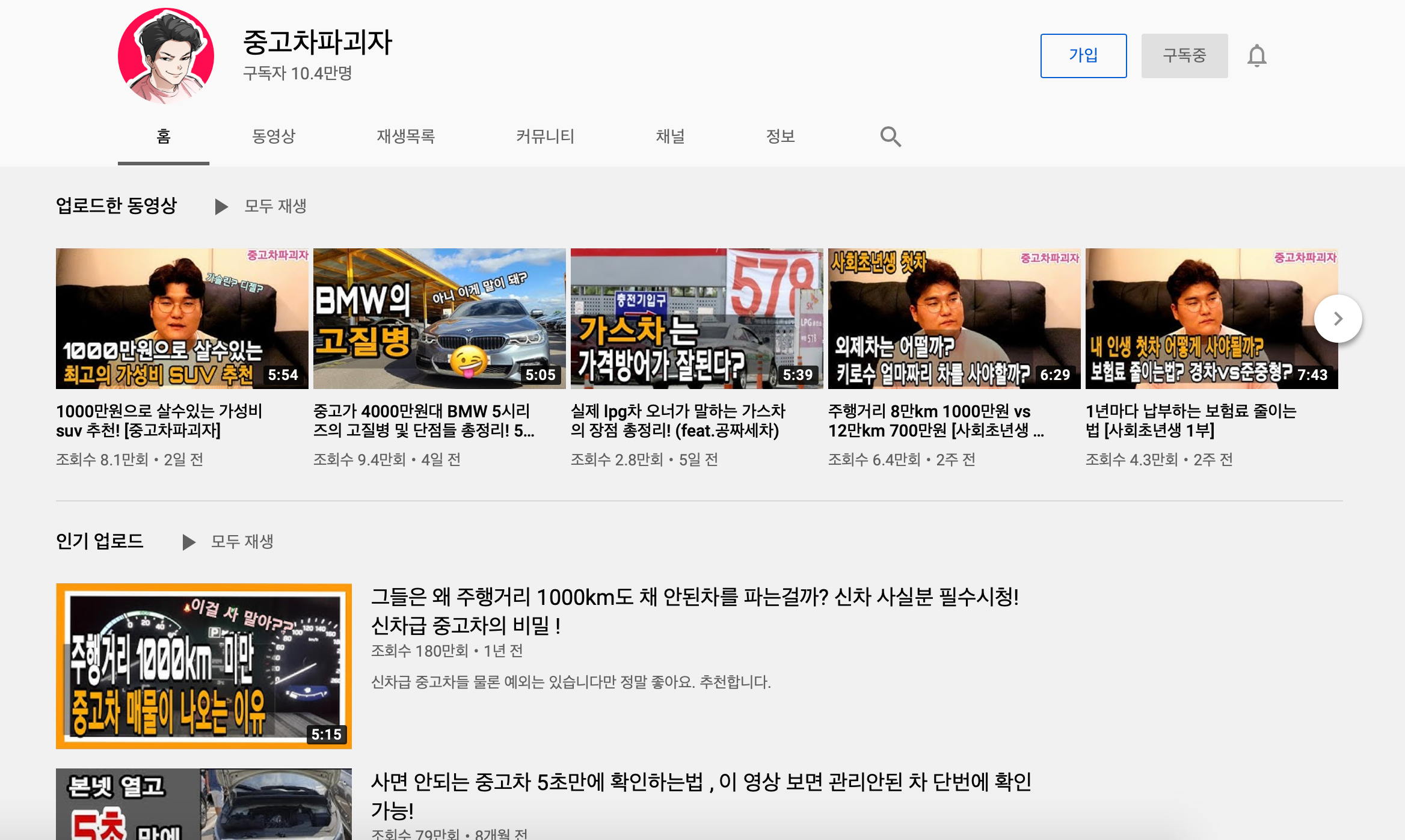 일명 '중고차 평가사'라는 직함을 지닌 유튜버의 채널입니다. 타이틀이 좀 세죠? '파괴자'라뇨···. 추측건대, 한때 수험생 참고서나 문제집 등에 왕왕 쓰이던 '뽀개기'(토익 뽀개기, 사탐 뽀개기, 영문법 뽀개기 등등)의 유사 버전이 아닐까 싶어요. <중고차 파괴자>가 제공하는 콘텐츠들은 대개, 중고차 시장에서 '호갱' 신세를 면하게 해주는 상식들이거든요. 전지적 소비자 시점의 자동차 관련 채널이랄까요. 이 채널의 부제가 '쉽게 배우는 자동차 상식'이기도 합니다. 특히 '중고차 구매 요령 가이드' 시리즈(현재 50편 업로드)는 사회 초년생, 또는 생애 첫 중고차 거래 예비자들에게 퍽 유용해 보입니다.