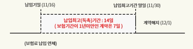 납입최고(독촉)기간이 끝나는 날까지 보험료를 납입하지 않을 경우 납입최고(독촉)기간이 끝나는 날의 다음날에 계약이 해지됩니다.
