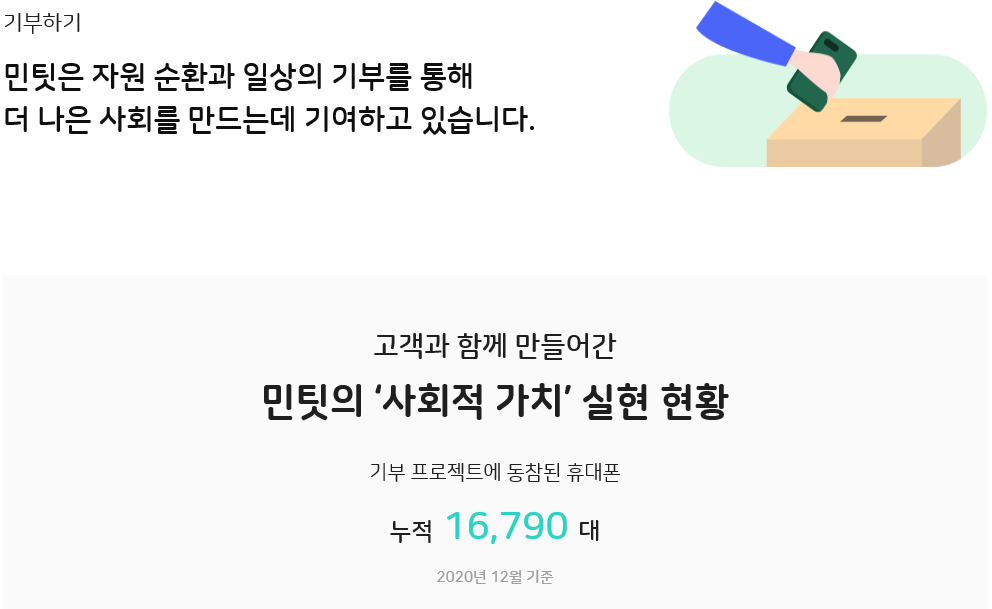 민팃은 가지고 있는 중고폰을 판매할 수도 있지만, 기부도 가능해요. 기부액은 국제구호개발 NGO인 '세이브더칠드런'에 전달됩니다. 쉽고 편리하게 중고폰을 재활용하고 기부할 수 있는 환경을 제공함으로써, 누구나 자원을 절약하고 환경을 보호하는 활동에 참여할 수 있도록 장려하는데도 그 의미가 크다고 합니다.
