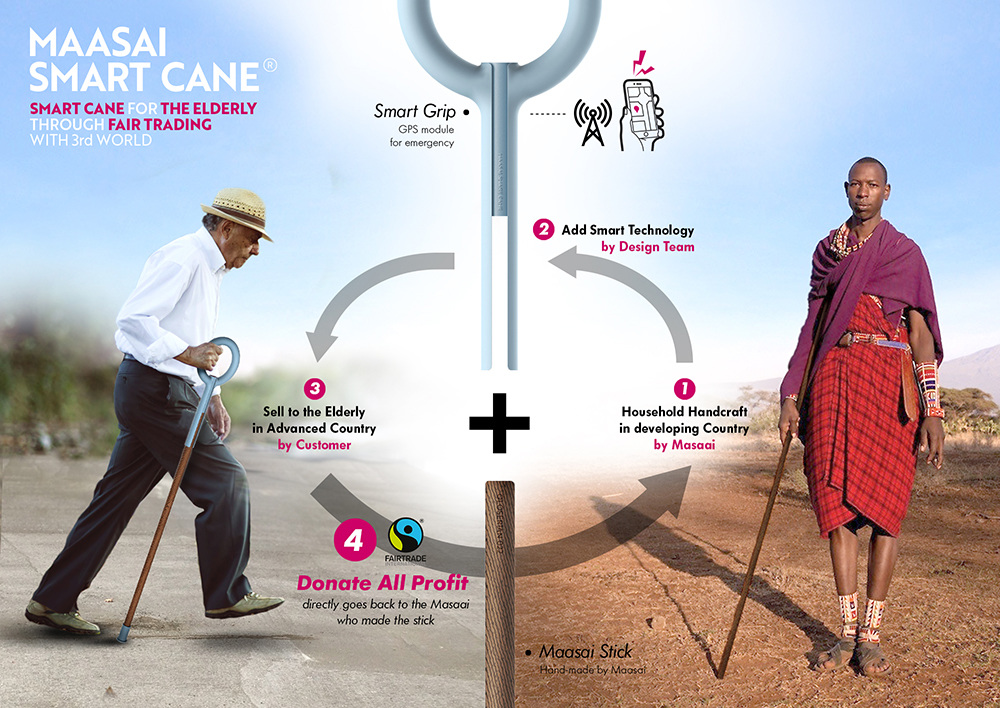 마사이족은 목재를 이용한 전통적인 공예 기술을 가지고 있지만, 경제적인 문제에 직면하고 있어요. 반면 잘 사는 나라의 노인들은 보다 적극적이고 안전한 일상생활을 추구하고 있지요. 배상민 교수와 ID+IM 연구원들은 마사이족이 만든 나무 막대기에 조립할 수 있는 스마트 손잡이(Smart Grip)를 디자인하면서 이 두 가지 문제를 함께 해결하려고 했답니다. 선진국을 위한 건강 보조 장치를 판매하여 발생한 수익을 마사이 부족에게 100% 기부하여 부족민이 이를 기반를 얻는 선순환 구조를 만든 것이지요. 이것이야말로 꿩먹고알먹고, 일석이조, 일타쌍피의 좋은예 아닐까요.