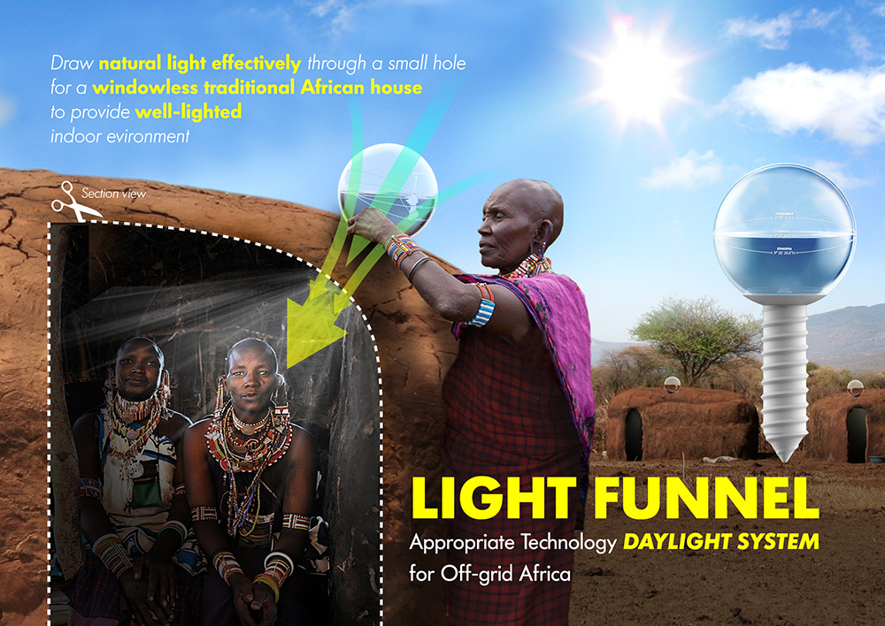 지금의 우리는 전기가 있어 '참 고맙다'는 생각 잘 안 하잖아요. 어쩌면 너무 당연하다고 생각해서 그런 건가 봐요. 그런데 그거 아세요? 지구촌 곳곳에서는 대낮에도 어둡고 눅눅한 흙집에서 전기도 수도도 없이 생활하는 곳이 참 많다는 것을요. '빛깔대기(Light Funnel)'는 전기가 연결되지 않는 아프리카 등 제3세계 지역에서 사용할 수 있는 새로운 형태의 조명 장치랍니다. 어떤 원리로 사용하느냐고요? 흙집 천장에 구멍을 뚫어 빛깔대기를 꽂으면 태양광이 깔대기를 통과하면서 내부의 물과 반사판에 의해 증폭돼 전기 없이도 흙집 내부를 환하게 비춥니다.