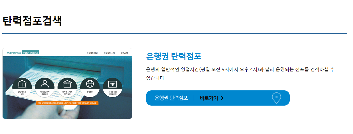은행연합회 > 소비자포털 > 금융서비스정보 > 탄력점포검색을 클릭해주세요!