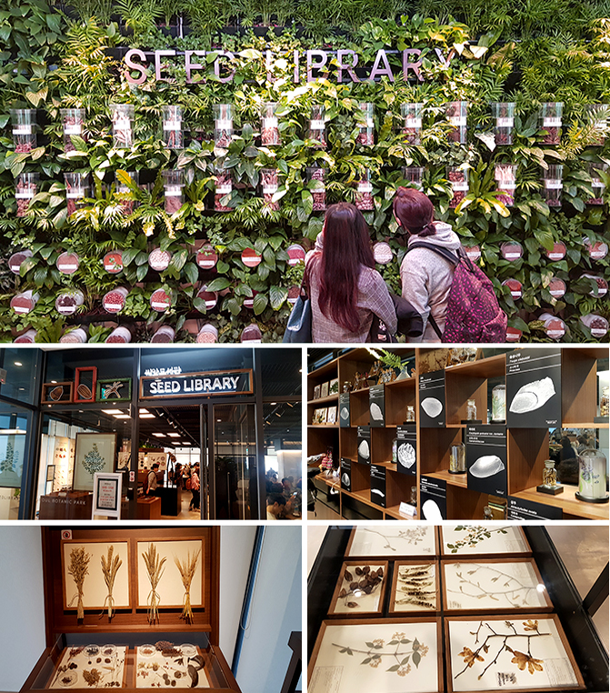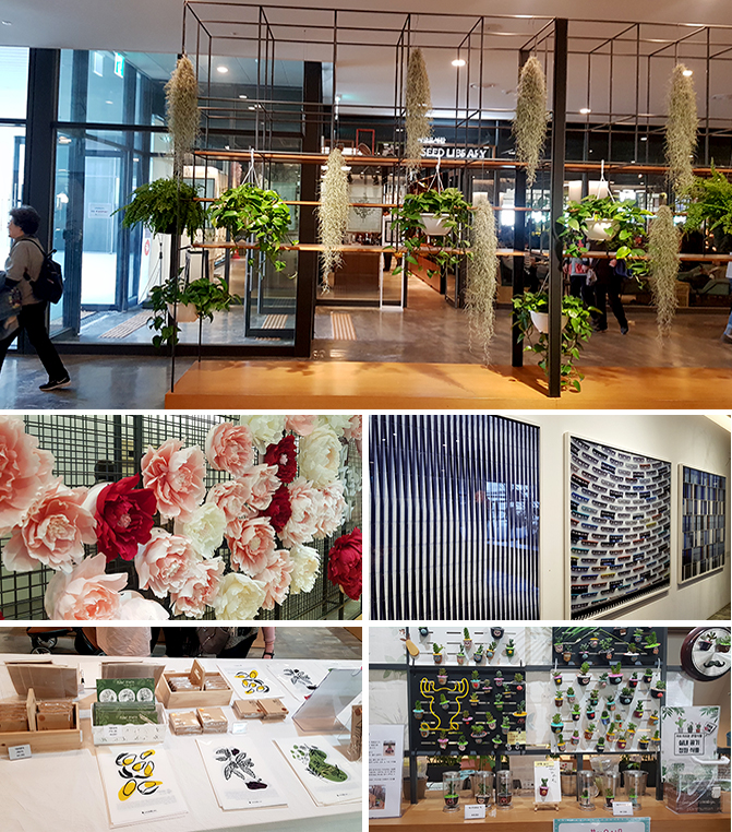 앞서 소개한 씨앗도서관이 있는 2층에는 다양한 즐길 거리가 있어요. 우선 6천 8백여 건에 이르는 식물, 생태, 정원, 조경 등 국내외 식물 관련 전문 서적과 DVD, 연속 간행물을 만날 수 있는 '식물전문도서관'이 있어요. 매주 월요일은 휴관일이니 이용에 참고해주시고요, 도서관 홈페이지(바로 가기)에 들어가면 저자강연회 등의 행사 일정을 볼 수 있으니 평소 식물에 관심이 있던 분이라면 관심을 가져도 좋으실 거예요. 필자가 또 흥미롭게 보았던 공간은 기프트샵인데요, 작고 아기자기한 다육 식물부터 식물을 패턴화, 단순화한 예쁜 문구류들, 실제 꽃과 식물을 말려 스티커로 만든 압화 스티커 등 하나하나 다 소장하고 싶은 물건들이 많더라고요. 좋은 분께 선물용으로 구매해도 참 좋은 물건들이었습니다. 이 밖에도 예쁜 꽃과 함께 사진을 찍을 수 있는 포토존, 갤러리처럼 꾸민 휴게 공간도 느낌이 참 좋았고요, 카페나 푸드코트도 잘 되어 있어 아이가 있는 가족이 와도 편리하게 시설을 즐길 수 있을 거예요.