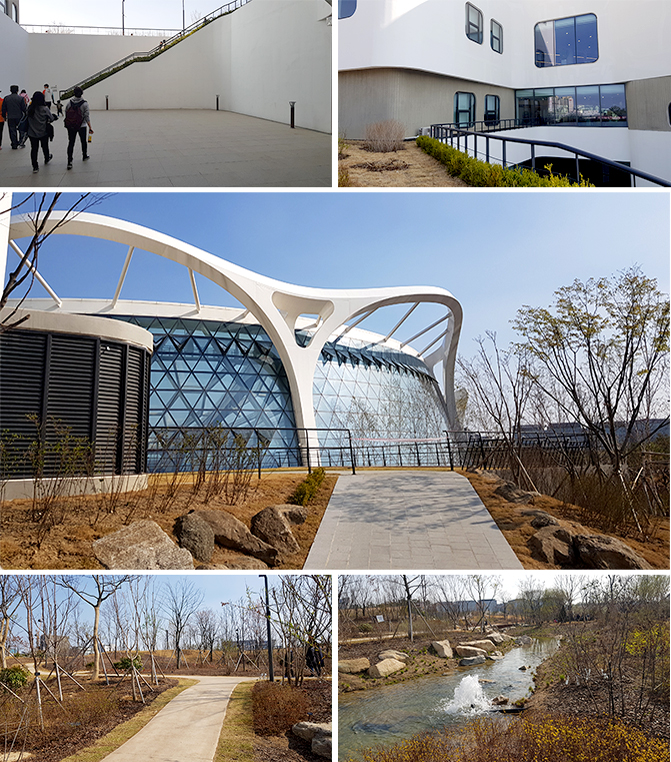 가장 궁금했던 1층의 온실을 지나 식물문화센터 2층의 각종 시설을 지나고 보니 밖으로 나가는 문이 있더라고요. 문밖으로 나가니 하얀 벽으로 둘러싸인 공간에 마치 하나의 무늬같은 까만색 계단이 이어져 있었어요. 꽤 높이 올라가 보니 온실 뒤편의 정원으로 이어졌고요. 아직 심은 지 얼마 안 된 나무들이라 조금은 황량해 보였지만, 나무 사이사이 이어진 오솔길이라든지, 작은 물가라든지, 온실 뒤편의 우뚝 솟은 유려한 기둥이 파란 하늘과 어우러져 참 멋지더라고요. 이곳을 통해 서울식물원 어디라도 갈 수 있어요. 호수 한가운데 서 있는 듯한 느낌의 호수원과 한강과 연결된 습지원까지 모두 연결되어 있으니까요. 햇빛 좋은 날 좋은 사람과 걷기만 해도 좋은 곳입니다.