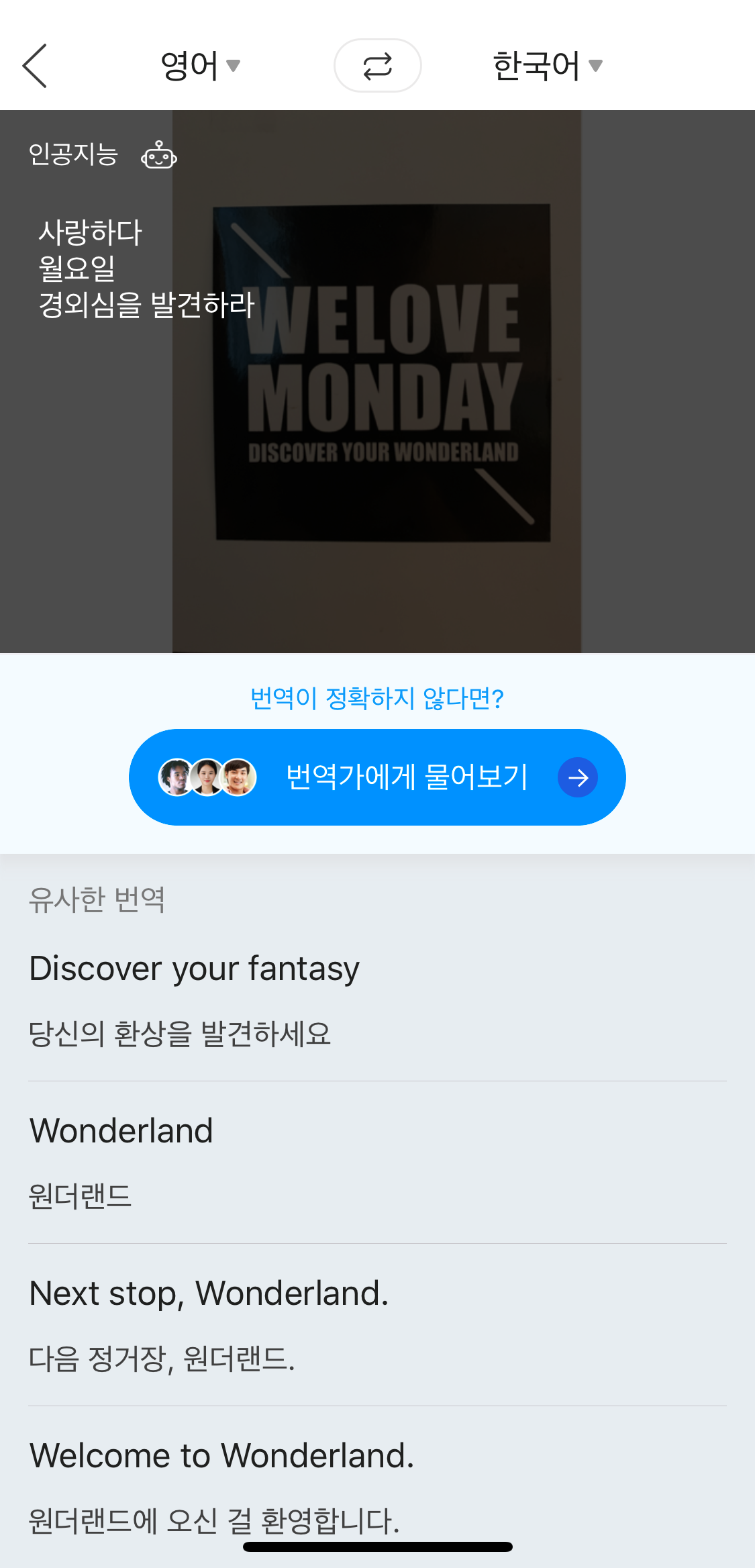 텍스트 번역과 마찬가지로 '번역가에게 물어보기'와 '유사한 번역' 메뉴가 뜨네요.
