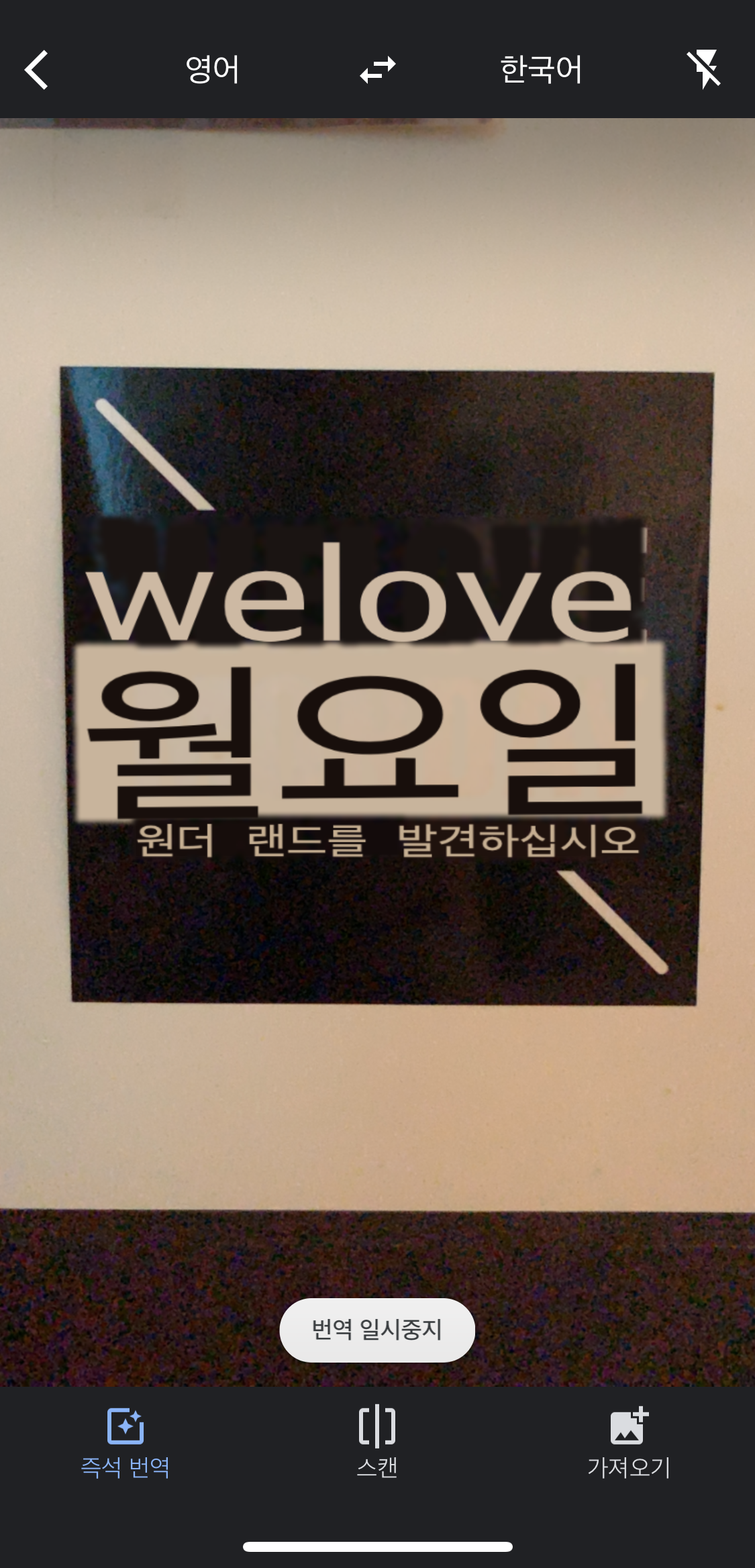 구글 번역 '카메라' 기능을 켠 뒤, 알파벳 문구가 적힌 스티커를 촬영해봤어요. 글자 수가 적은 대상일 때 OCR 번역 정확도는 올라간답니다. 해외에서 도로 표지판, 상점 간판, 안내판 등을 번역할 때 알맞을 듯합니다.