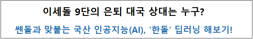 ‘쎈돌’ 이세돌의 마지막 대국 상대 ‘한돌’. 과연 얼만큼의 실력을 지닌 고수인지, 어떤 명국을 보여줄지 기대됩니다. 뭐, 일단 숫자만 비교해서는 바둑 AI가 우세해 보이긴 합니다만, 자고로 바둑은 (바둑)판이 깔려야 승부가 나는 경기 아니던가요? 쎈돌 대 한돌, 한돌 대 쎈돌. 두 바둑기사의 대국은 어떤 승부를 보여줄지, 그 결과로 인해 우리나라의 AI 기술은 또 얼마나 더 진보할지! 우리의 쎈돌은 정녕 이렇게 은퇴하는 것인지··· 여러모로 우리의 이목을 집중시키는 이세돌 9단의 은퇴 대국, 기대가 됩니다.