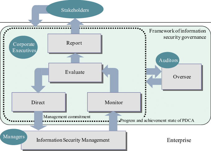 [그림 2]는 정보 보안 거버넌스가 어떻게 이루어지는지 도식화한 표예요. 정보 보안 부서(information security management)는 모니터링(Monitor) 및 평가(Evaluate) 자료를 경영진(Stakeholders)에게 보고(Report)합니다. 경영진의 피드백을 반영한 업무 지시(Direct)가 내려오고, 이를 바탕으로 모니터링-평가-보고 절차가 반복됩니다. 감사관(Auditor)은 이 모든 과정을 두루 감독(Oversee)하고요.